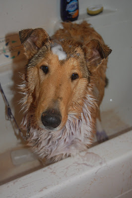 On Sunday, we took Claire and Gibson to Ellen and brought home Phoebe. Gibson got "all purtied up" for his first set of shows this upcoming week-end. He doesn't have much patience for things he doesn't enjoy so I got soaked when he jumped out of the bathtub twice, then it was steady complaining to have his nails filed and his coat dried. He was good for the drive to DE and was immediately comfortable at Ellen's. Gibson and Claire are now on their way to NJ for his debut and hopefully, her championship. Everybody, keep your fingers crossed and send positive thoughts the judges' ways!